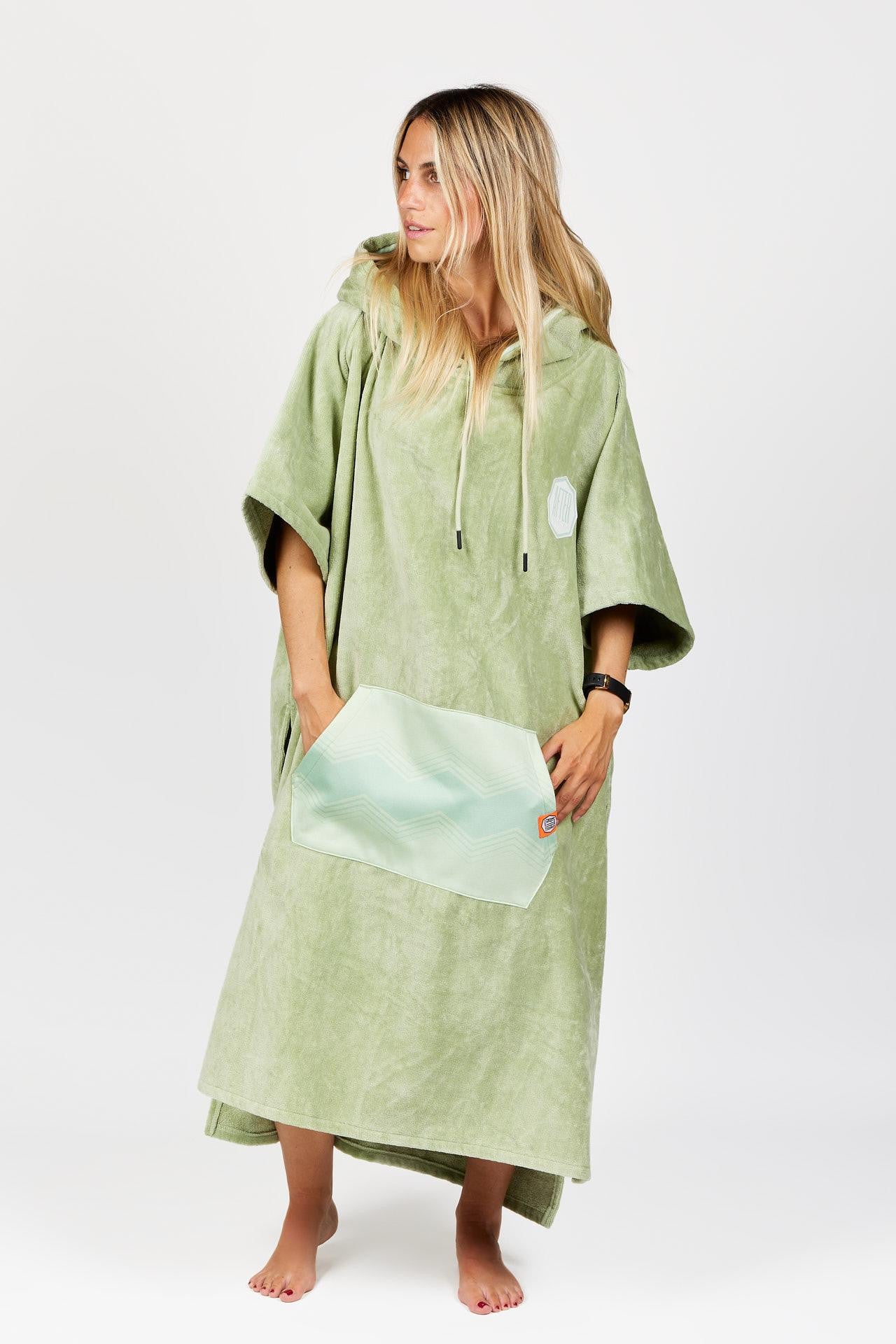 Elegancia, confort y estilo se dan cita en el poncho High End Tender Green. Su corte largo y su tejido grueso te mantienen perfectamente abrigado después de cada sesión o baño. El bolsillo canguro y el interior de la capucha, adornados con un motivo étnico único, aportan un toque auténtico y sofisticado.