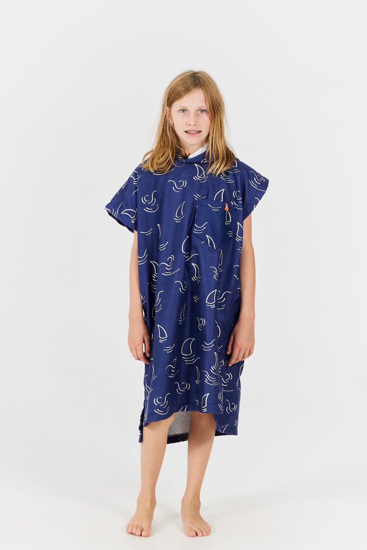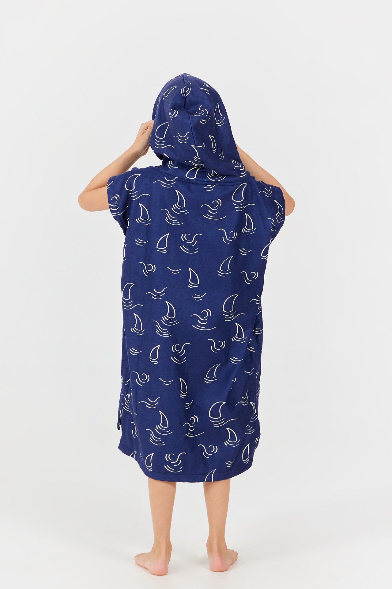 Cómodo y práctico, el poncho de cambio infantil Shark, con su amplia capucha, es perfecto para secarse rápidamente después del baño, la piscina o la playa. Su interior de felpa 100% algodón, suave y muy absorbente, permite mantenerse caliente y seco. Gracias a su corte amplio y sus amplias aberturas para los brazos, el poncho de baño Shark se pone fácilmente. Su exterior de 100% poliéster asegura una reproducción óptima de los estampados, con motivos de aletas de tiburón estilizadas sobre fondo azul marino que encantarán a todos los pequeños amantes del océano.