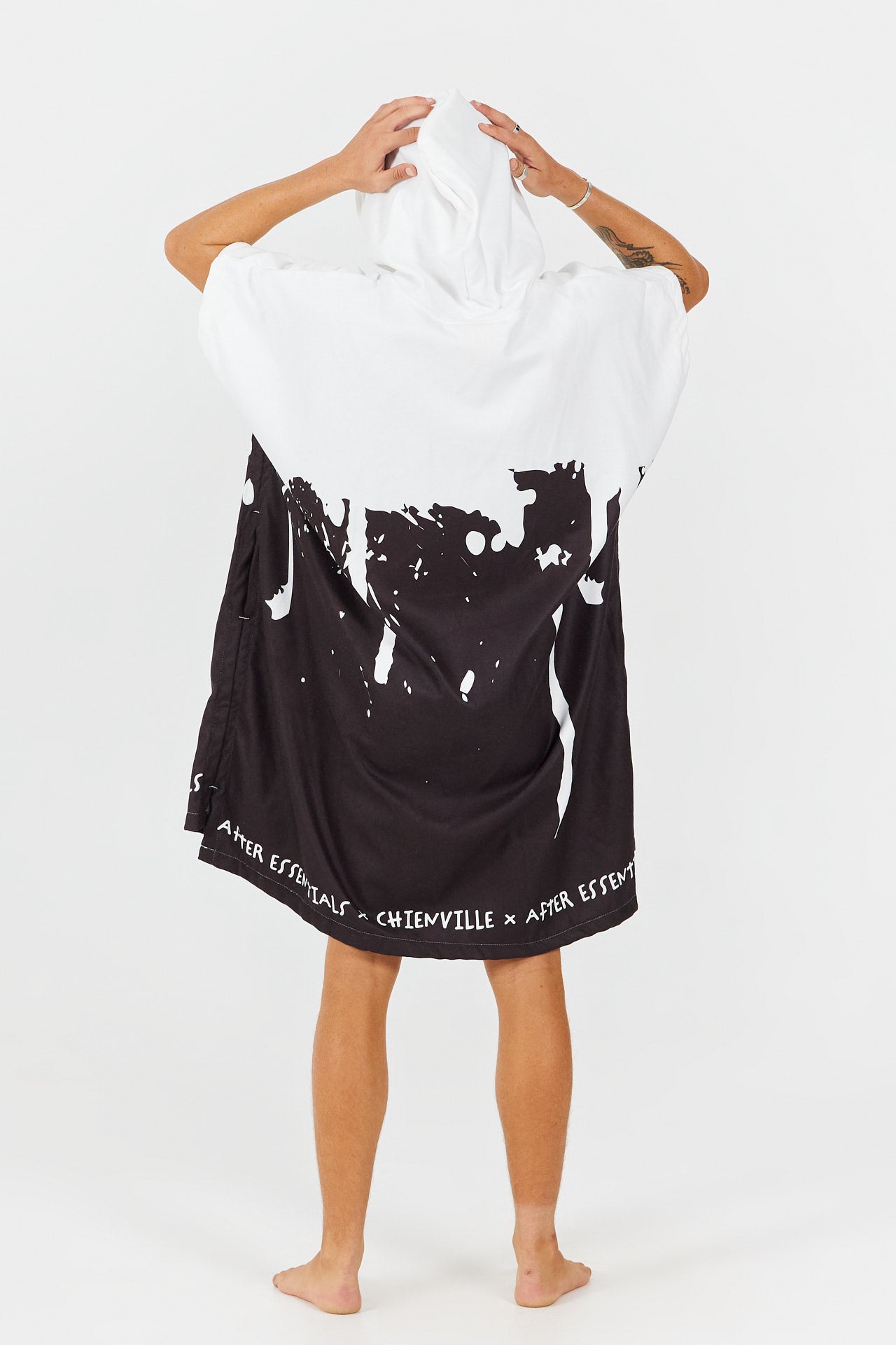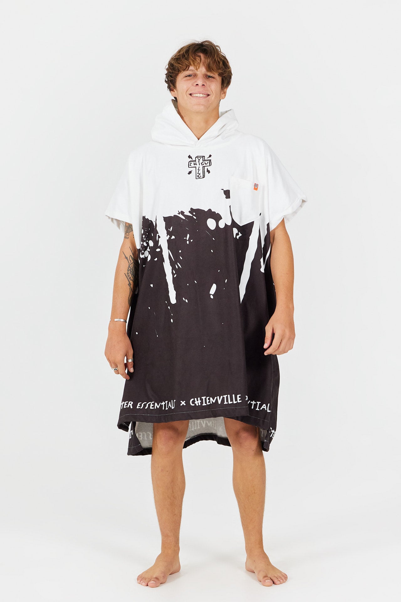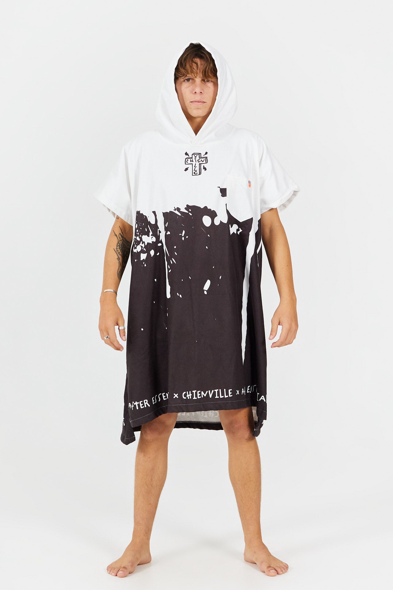 Fruto de la colaboración con el shaper Chienville, este poncho de surf encarna un espíritu libre y comprometido, mezclando un look punk con inspiración skate. Diseñado para la playa y las sesiones after, refleja el universo crudo y creativo del shaper afincado en Soorts, reconocido por sus formas y diseños innovadores de tablas.